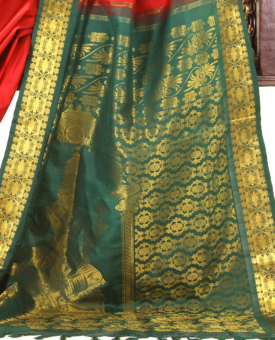 Pallu: Also in dark green with an image of Adhideva ‘Thuvashta’ . And the symbol of Natchathiram is also in peedam at the right and left sides of the bottom portion.