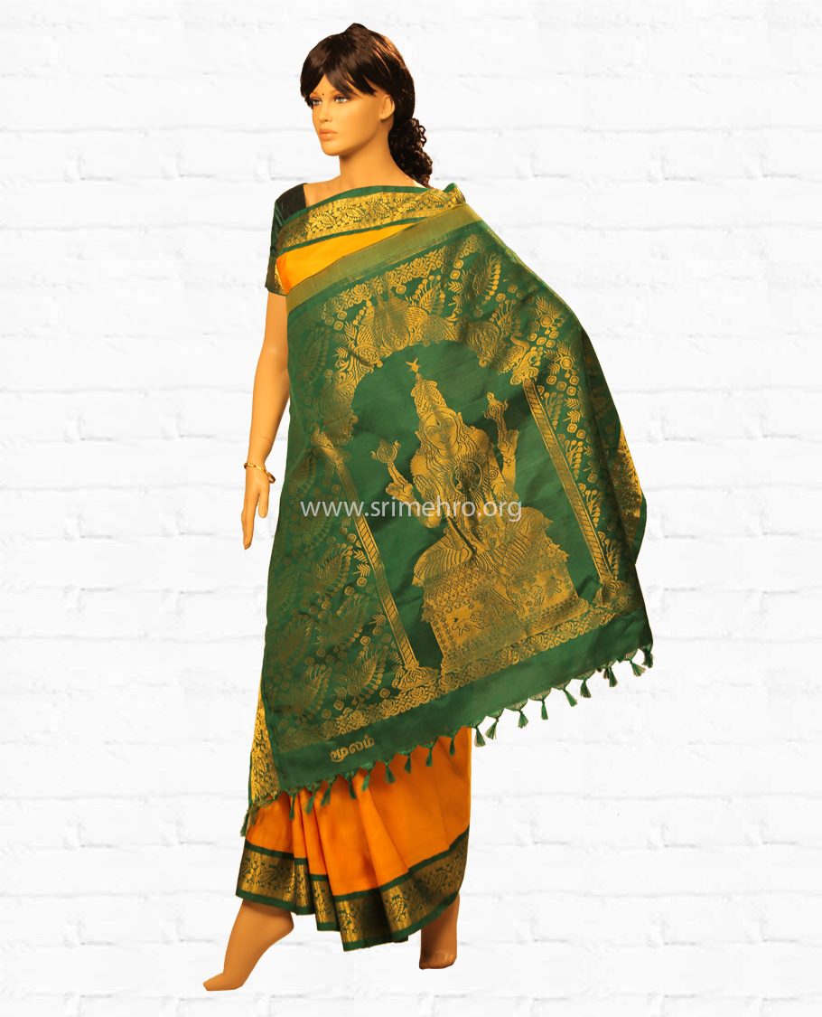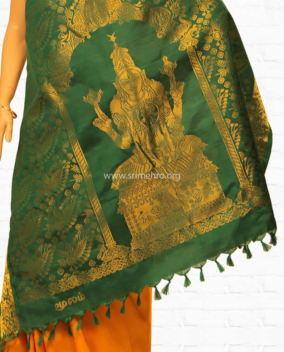 Pallu: Also in green colour with an image of the Adhideva ‘Niruthi’. And the symbol of the Natchathiram ‘Tail of a lion ’ is also in peedam at right and left sides of the bottom portion.