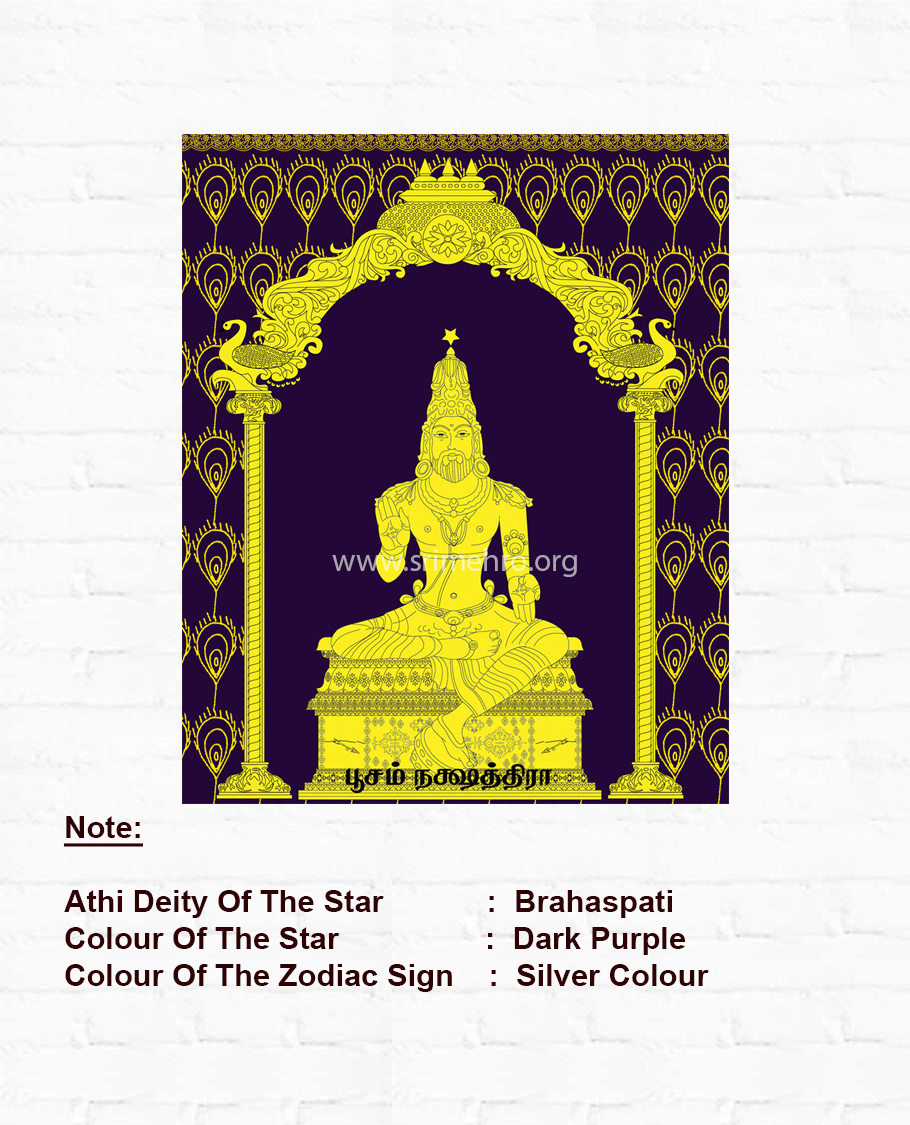 Poosam Natchathiram consists of a single star and it appears like an arrow in the sky. The Adhi deva is Braghaspathi . He is the priest of all devas. Bharathan, the brother of Lord Sri Rama was born in this poosam Natchathiram.